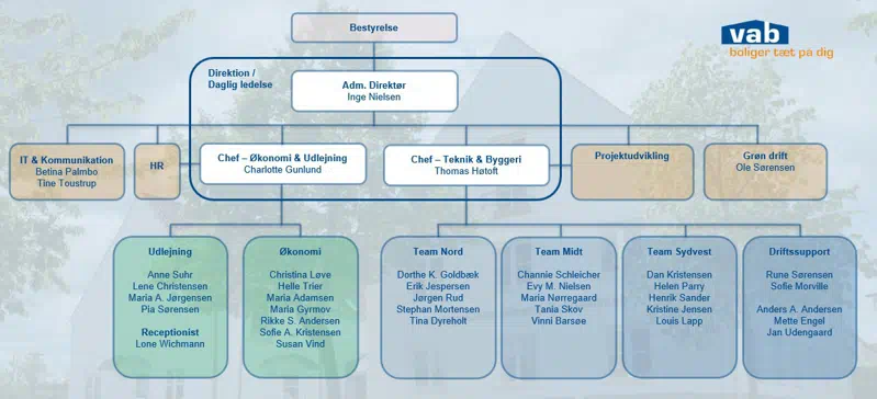 Organisationsbestyrelsen har det overordnede ansvar for boligselskabets drift. Bestyrelsens medlemmer vælges af repræsentantskabet.