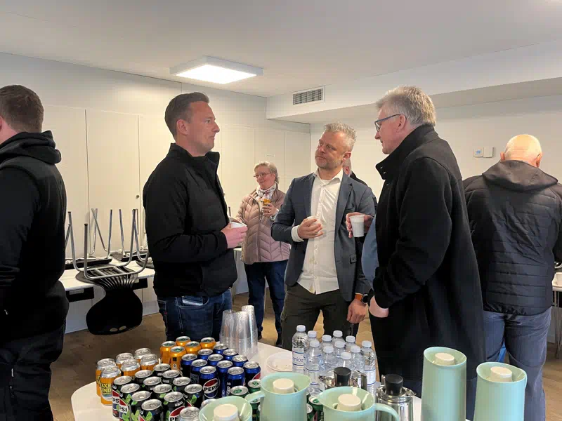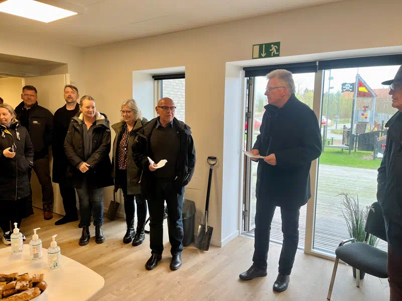 Da regnvejrsskyer truede i baggrunden, trak alle ind i det nærliggende beboerlokale, hvor der blev budt på kaffe og kage. Her holdt såvel Karsten som Stampe taler, hvori begge understregede vigtigheden og glæden over at kunne være med til at opføre og tilbyde gode og trygge boliger, og takkede for det gode samarbejde kommunen og boligselskabet imellem.