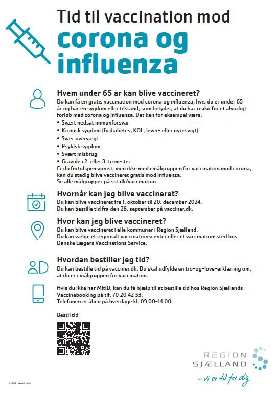 Sundhedsstyrelsen oplyser, at borgere under 65 år med risiko for et alvorligt sygdomsforløb kan få en gratis vaccine mod covid og influenza.