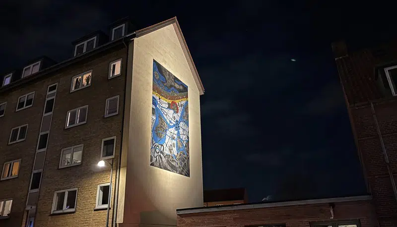 I Blegstræde i Holbæk kan man på den nordlige endegavl nu også nyde det flotte gavlmaleri i mørke. Maleriet har fået installeret belysning, som er blevet et lysende pejlemærke i bybilledet. Lyset får farver og detaljer frem i værket, hvilket giver det en helt ny dimension i aftentimerne.