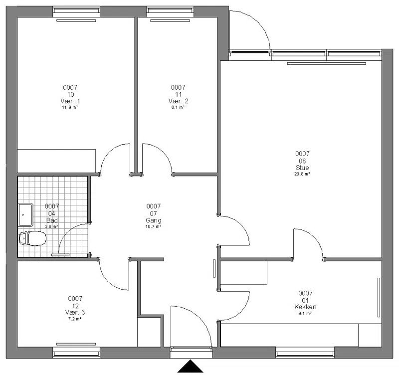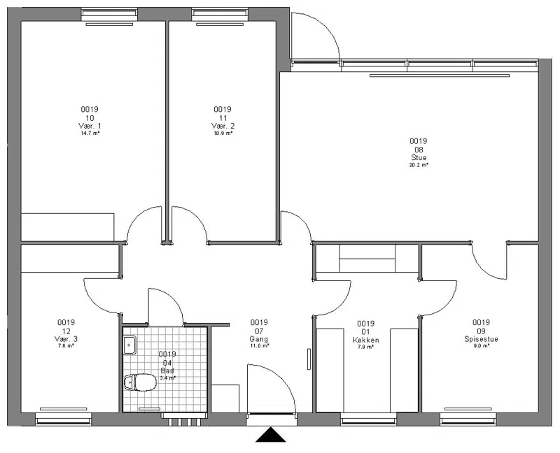 Rækkehuse opført i gule sten i 1 plan, 23 boliger - 2, 4 og 5 rums. Byggeår 1971.